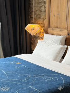 Le « monte et baisse », est une suspension traditionnelle qui était souvent recouverte d’un délicat napperon brodé afin d’adoucir et de réguler l’ambiance lumineuse d’une cuisine ou d’une salle à manger d’un mas provençal. C’est en souvenir de ses soirées d’enfance illuminées par ces broderies que Magali Avignon a imaginé cette délicate série limitée en collaboration avec la brodeuse marseillaise Sarah Espeute. Taillées dans deux draps anciens assoupis dans nos armoires depuis plusieurs générations, ces 25 pièces uniques brodées à la main racontent la poésie et la douceur des soirées méditerranéennes.