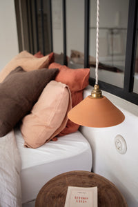 Cette suspension en applique peut être utilisée en tant que liseuse . Elle est fournie avec une potence en laiton vieilli, un fil de lin tissé de 60cm, les vis et chevilles. Elle s'insère aussi bien dans un décor brut que plus sophistiqué, dans lequel elle apportera incontestablement une langueur toute méditerranéenne.