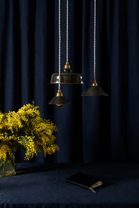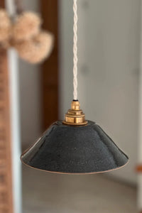Tournés à la main par une artisane passionnée, nos luminaires sèchent patiemment sous les oliviers avant de passer au four. Les pièces sont ensuite émaillées puis remise au four pour prendre leur teinte bleue nuit changeante et leur aspect brillant définitif..