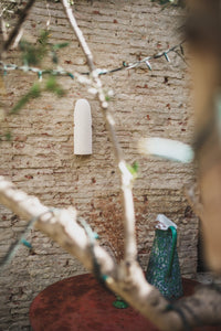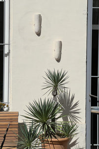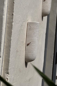 Façonnées à la main en grés chamotté blanc non loin du rocher de Saignon, nos appliques Rosario sont inspirées des tuiles provençales que l'on accrochait simplement aux murs de plâtre des mas de la région. Revisitées en forme d'ogive en hommage à l'architecture de la chapelle, elles portent le nom de l'artiste sculptrice argentine Rosario qui aura bâtit - pierre après pierre - sa maison singulière située également au sommet du rocher de Saignon.