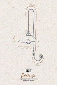 Elégante Lisette en porcelaine. Coulée à la main en petite série à Limoges, elle se mêle au dessus d'une table de campagne, se suspend harmonieusement en tête de lit, ou dans une une cuisine.