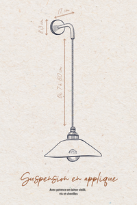 Cette suspension en applique peut être utilisée en tant que liseuse . Elle est fournie avec une potence en laiton vieilli, un fil de lin tissé de 60cm, les vis et chevilles.