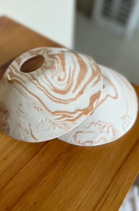 Chaque pièce est unique et la densité des marbrures directement liée au mélange des terres de l'artisan le jour de l'estampage. C'est ce qui fait la singularité et la préciosité de ces pièces artisanales .