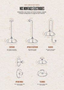 Cette suspension en applique peut être utilisée en tant que liseuse . Elle est fournie avec une potence en laiton vieilli, un fil de lin tissé de 60cm, les vis et chevilles.