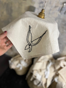 Elle est livrée avec tout le matériel nécessaire : Napperon brodée main, pièce en céramique émaillée, douille en laiton massif, cable tissé lin, rosace en porcelaine, cheville, vis et wago.