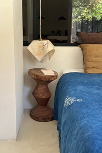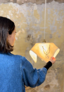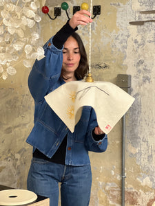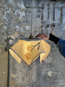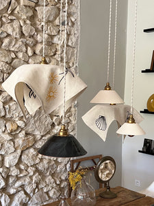 Le modèle « Fleurs coupées » est illustré de fleurs fraiches, d'un sécateur et d'une abeille. Disponible en lin naturel, cette suspension nous transporte entre garrigue et cabanon, après un après-midi entre soleil et mer. À la fois objet d’usage et oeuvre d’art lumineuse, elle peut s’installer au dessus d’une table de campagne, dans une cuisine ou en liseuse.