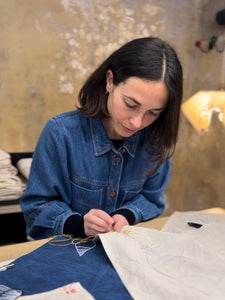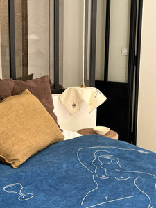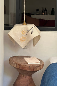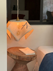 Le « monte et baisse », est une suspension traditionnelle qui était souvent recouverte d’un délicat napperon brodé afin d’adoucir et de réguler l’ambiance lumineuse d’une cuisine ou d’une salle à manger d’un mas provençal. C’est en souvenir de ses soirées d’enfance illuminées par ces broderies que Magali Avignon a imaginé cette délicate série limitée en collaboration avec la brodeuse marseillaise Sarah Espeute. Taillées dans deux draps anciens assoupis dans nos armoires depuis plusieurs générations, ces 25 pièces uniques brodées à la main racontent la poésie et la douceur des soirées méditerranéennes.