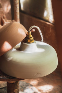 Tournée patiemment par des mains expertes dans une poterie au savoir faire ancestral, Ursule est déposée "à la sèche" sous le soleil d'Aubagne, puis "tournassée" avant d'être cuite au four. Le grain de sa peau de terre garde la trace du geste et ses formes sont pures et généreuses.